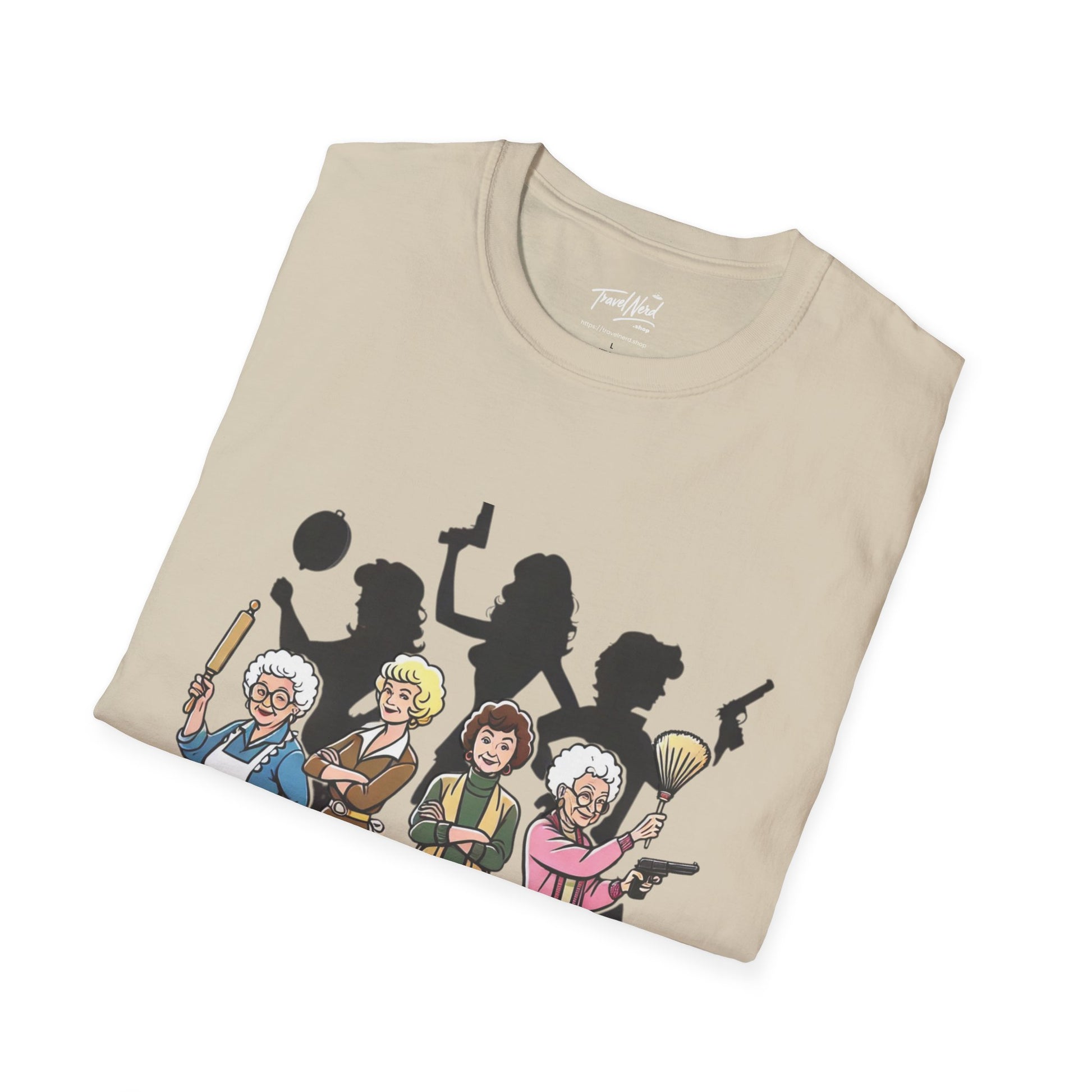A Golden Girls T-shirt featuring cartoon versions of the ladies from the show. This soft and stylish tee is perfect for fans of the iconic TV series, adding a fun and nostalgic vibe to their wardrobe. Ideal for casual wear, lounging around the house, or as a statement piece for a themed party or event. Suitable for adults and great for gifting on birthdays, holidays, or any occasion celebrating friendship and humor.