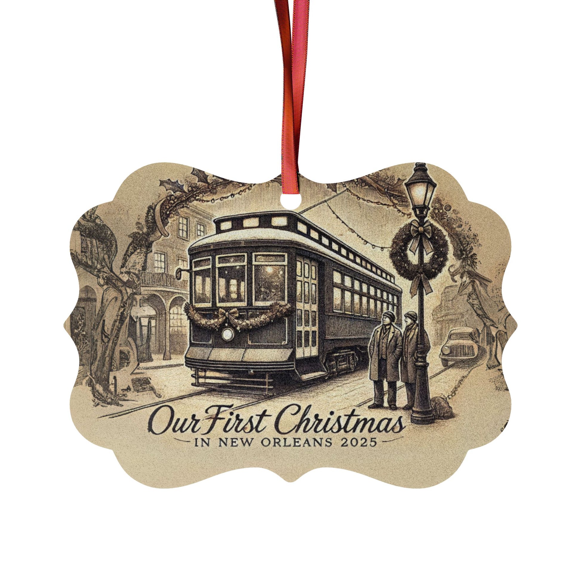 Capture the magic of your first Christmas in New Orleans with these aluminum ornaments featuring a festive design. Perfect for decorating your tree or giving as a special gift to commemorate the occasion. Ideal for couples or families celebrating their first Christmas in a new city.