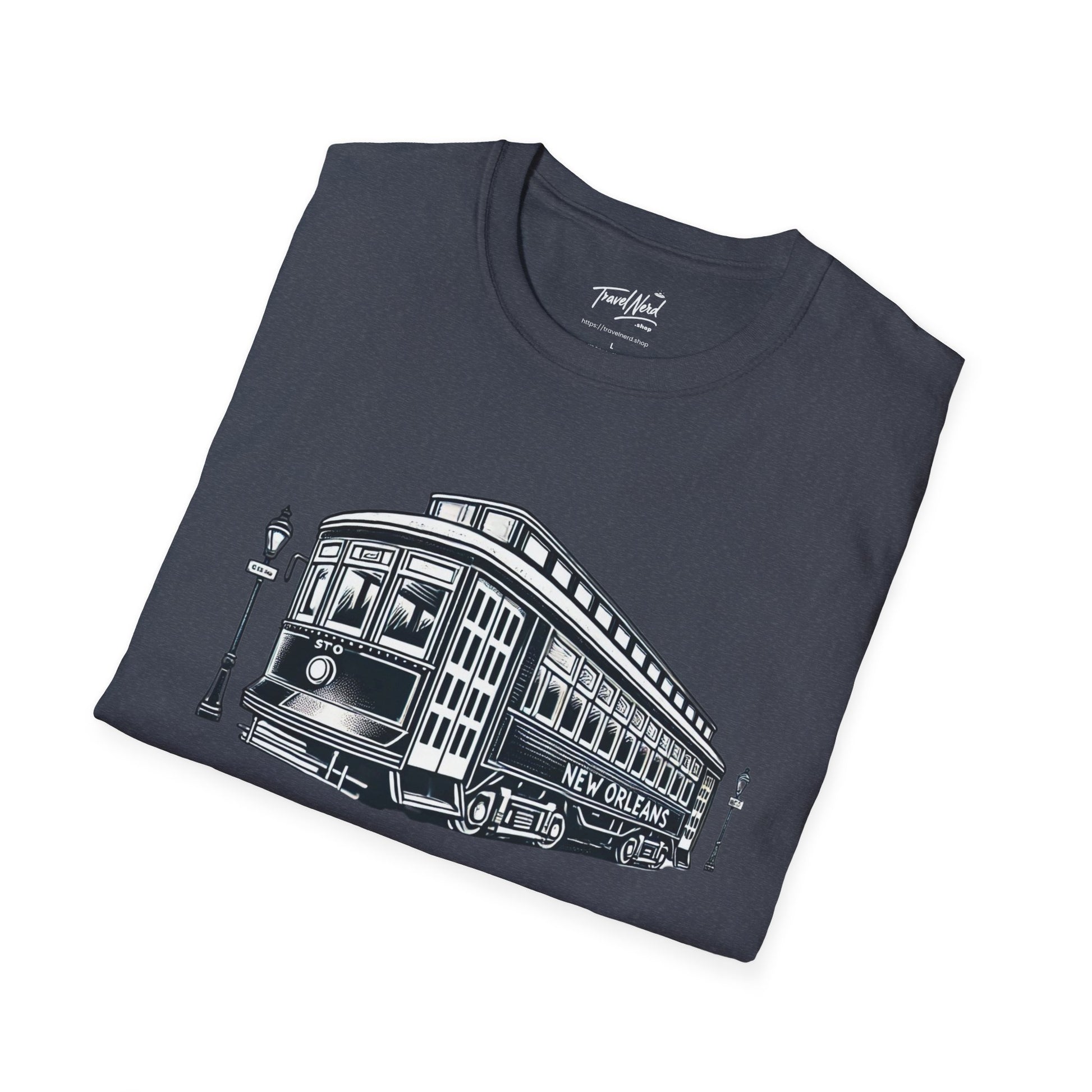 Vintage New Orleans streetcar 1835 design printed on a durable and comfortable unisex T-Shirt. Perfect for those who love the vintage vibe and want to showcase their love for New Orleans. Ideal for adults looking for a unique and stylish casual wear option. Suitable for occasions like vacations, casual outings, and everyday wear.